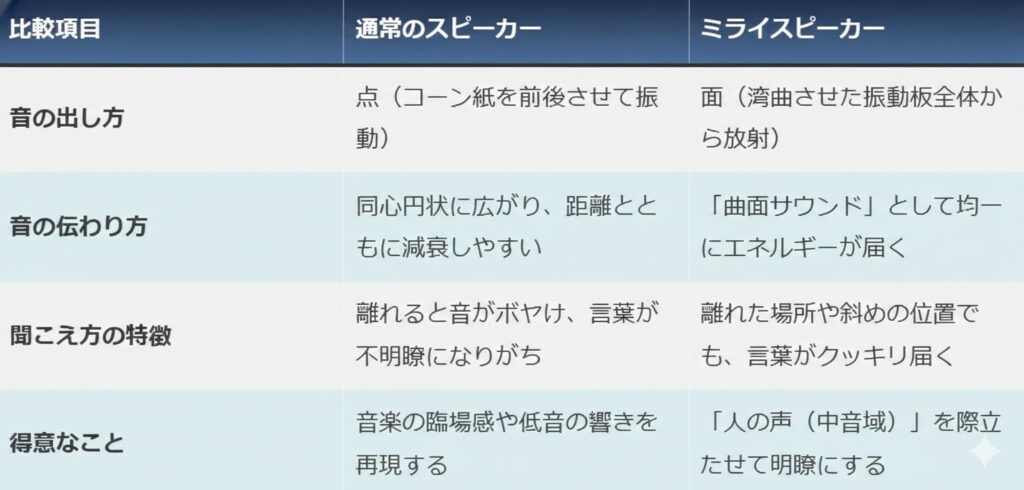 ミライスピーカーが「声」をクリアに届ける秘密は、特許技術である「曲面サウンドシステム」にあります。従来のコーン型の振動板で音を出すスピーカーとの違いをまとめました。