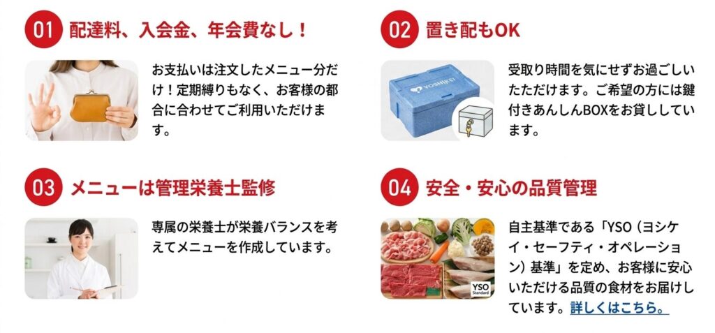 送料が無料である点も、見落とせない大きな魅力です。スーパーまでの交通費や買い物の時間、重い荷物を運ぶ労力を考慮すると、ヨシケイの配達サービスは非常に経済的であると言えます。